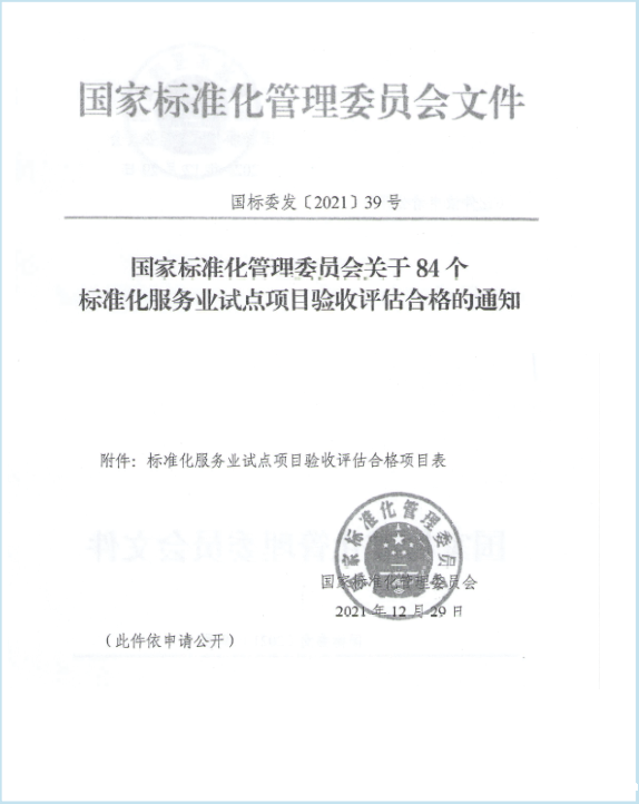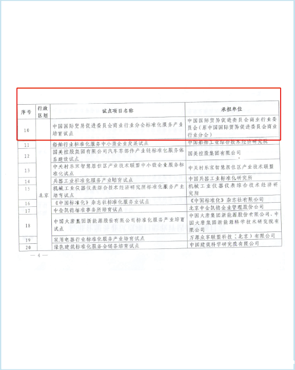 国家标准委印发了《关于84个标准化服务业试点项目验收评估合格的通知》 (国标委发[202139号) ,由中国贸促会商业行业委员会承担的中国国际贸易促进委员会商业行业分会标准化服务产业培育试点”项目以92分 (满分100分) 的高分获验收通过。