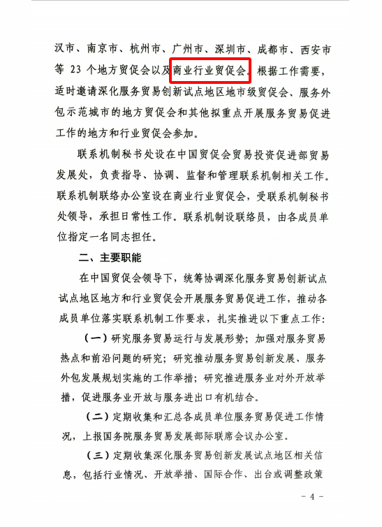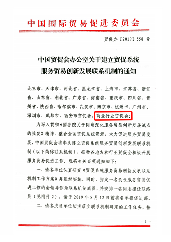 中国贸促会商业行业委员会承担贸促系统服务贸易创新发展联系机制联络办公室职能。